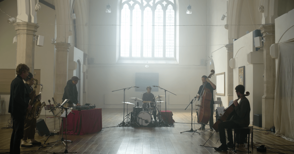 À l’occasion de la sortie de son album Voices of Bishara, paru le mois dernier sur le label Brownswood Recordings, le batteur et producteur anglais Tom Skinner est venu interpréter plusieurs morceaux à l’église St Luke West Holloway de Londres. Il est accompagné de cinq musiciens : aux samples, Paul Camo ; à la contrebasse Tom Herbert (Polar Bear, Acoustic Ladyland…) ; au violoncelle, Kareem Dayes, frère du batteur Yussef Dayes, avec qui il fonde le groupe United Vibrations ; et enfin, Chelsea Carmichael (SEED Ensemble, Neue Graphik Ensemble, Theon Cross…) et Robert Stillman, tous deux au saxophone, remplaçant pour ce live la non moins talentueuse Nubya Garcia et l’inévitable Shabaka Hutchings, chef de file du renouveau du jazz britannique. Tom Skinner est pour sa part loin d’être inconnu au bataillon. Ayant collaboré avec de nombreux artistes renommés tels que Grace Jones, Mulatu Astatke, Floatings Points ou encore Zero 7, le londonien est surtout connu pour avoir été pendant une dizaine d’années le batteur du groupe Sons of Kemet, hélas récemment dissout. Plus récemment, il s’est illustré aux côtés des membres de Radiohead Thom Yorke et Jonny Greenwood en fondant le groupe de rock The Smile.